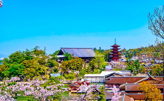 厳島神社で有名な観光地。春は桜と海の景色が調和する特別な環境です。