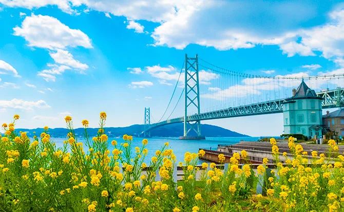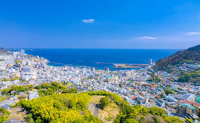 温泉や海の幸が楽しめるリゾート地。春は花々が咲き誇り、観光客でにぎわいます。