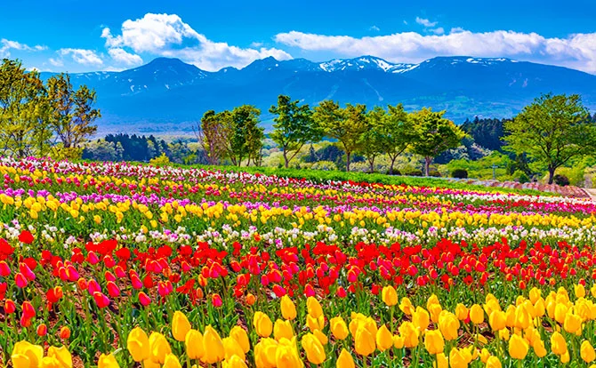 高原リゾートとして人気。春の花々と温泉を満喫できる環境でのお仕事です。