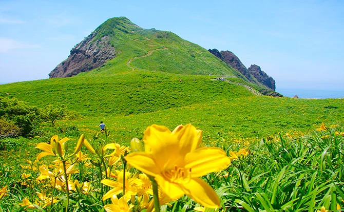 北海道の最北に位置する絶景の離島。透き通る海と雄大な利尻富士、可憐な高山植物が織りなす自然美が魅力。
