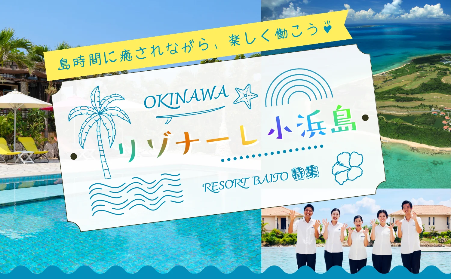 青い海、白い砂浜…リゾート気分100%! 沖縄のリゾートバイトは、観光地・離島・リゾートホテルなど、働きながら南国を満喫できる求人が充実。琉球文化や海の絶景を楽しみながら過ごせる毎日です♪